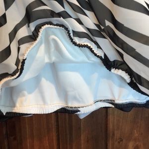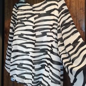 Black and white, lined sheer top, 3/4 length angled sleeve, elastic bottom