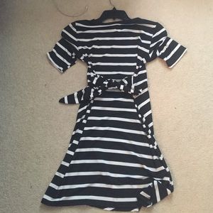 Polyester with sleeves right above the elbow, this dress could go to the office, or church, or be played down to a cook out. It's flowy and really comfortable. Tie belt and rouching feature that gathers at the hip. Very flattering