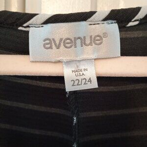 The outfit is a black and white striped fit and flare dress, likely by the brand AVENUE. The dress features a fit and flare silhouette, which is fitted through the bodice and waist and flares out into a full skirt. It has short sleeves. It has a prominent horizontal black and white striped pattern and a scoop neckline. It is a midi length.