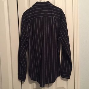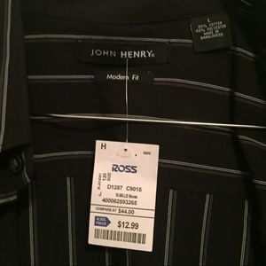 A modern fit button up shirt that is black with thin white and grey stripes. The pattern is 4 parallel stripes. In the pattern, there are 2 white and then a small space before the 2 grey stripes. The shirt has never been worn and still has its tags. It is in excellent condition. The fabric is 60% cotton and 40% polyester.