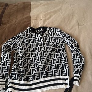Black and white round neck women’s sweater in blackk and white with F all over. Has a black ribbon by the wristt that can be tied into A bow