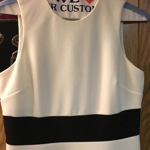 Black and white woman's sleeveless dress size 2P, that comes about 2 to 3 inches above the knee. NWOT, has white silk under slip. dry clean only, no rips tears or loose stitching zips up in the back midway up