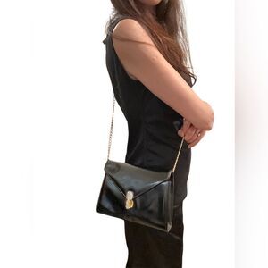 This chic crossbody bag features a sleek black design with a striking gold skull clasp on the front flap. The gold-toned chain strap adds a touch of elegance, making it perfect for both casual and formal occasions. Its medium size offers ample space for essentials while maintaining a stylish appearance.