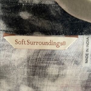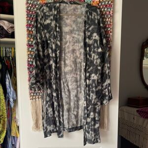 Stylish black and white tie-dye kimono cardigan. Perfect for layering. Linen from Soft Surroundings.