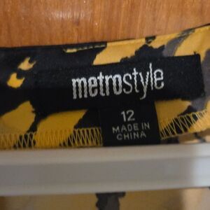 This sleeveless mini dress showcases a bold black and yellow pattern, perfect for work or cocktail events.