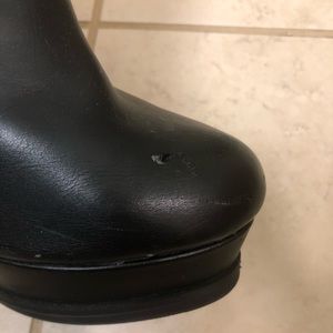 Black leather and suede round toe platform boot. Zips in the back. 5 1/2 inch heel; 1 1/4 inch platform. Has a scratch on the front toe area of the left boot.