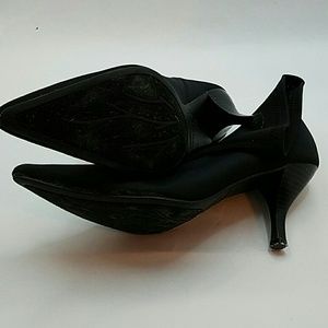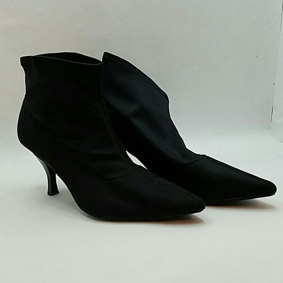 Sexy yet sophisticated litte black booties. Fabric makes them soft and comfy. "Stuffed" one to show you shape of boots. Approx 2 inch heel and pointed toe. Worn but only noticeable on the bottom some.!q I liked wearing them with office apparel and rock gear like black Capri leggings, an oversized off-one-shoulder shirt with a skull on it and a thick spiked belt!