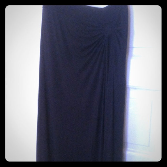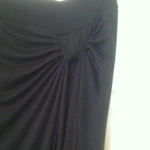 Black asymmetrical side knot maxi skirt. NWOT...never worn! Hide side slit up leg leg. Short skirt attached underneath that hits about mid-thigh. Side knot at top of slit. 95% rayon, 5% spandex/elastane.