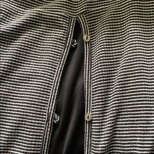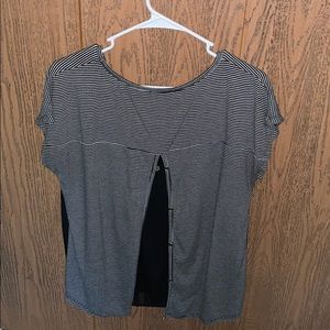 Black and white striped back button down. Breathes very well, and you can button some or all in the back. Fits more like a medium