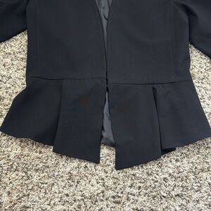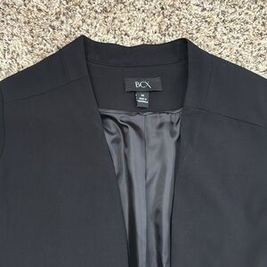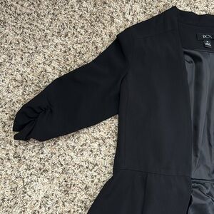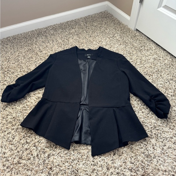 Black 3 quarter length sleeve blazer. End of sleeves are cinched. No buttons or zippers. Full length, no padding in shoulders. Size medium. Brand is BCX.