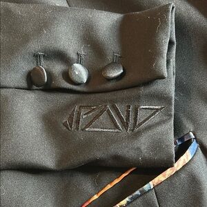 This black blazer combines a modern aesthetic with traditional tailoring, featuring structured shoulders and a vibrant interior lining. Its classic design makes it a versatile choice for both business and formal occasions.