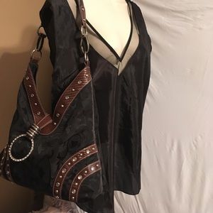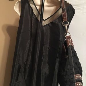Black blouse with mesh and piping around neck