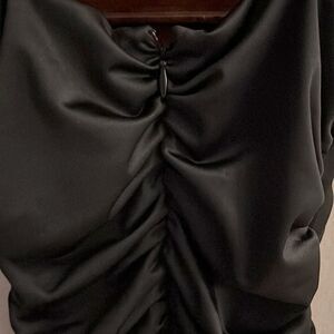 Black bodycon dress with shirred bust and ruching detail on the sides. Bottom ties allow you to adjust the dress length. Adjustable straps with zipped close. Excellent condition with no rips stains or tears. Brand tag removed.