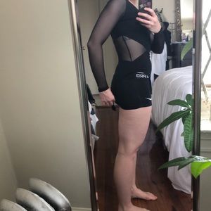 Black cotton & mesh onesie with snap between-thigh connection. I’m wearing nike shorts underneath in the pictures, and I don’t have it connected at the bottom. Great for a night out on the town, paired with pants or a skirt. Arms err on the tight side.