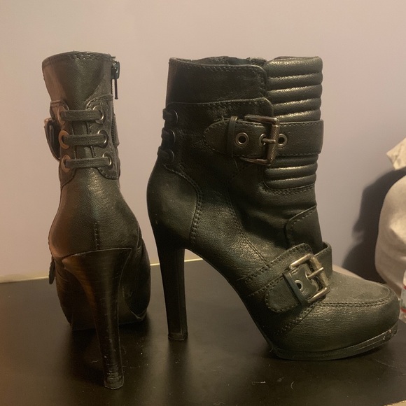 Black boot with silver metal accents and laced design in the back. Zipper located on the inner ankle for easy on/off.