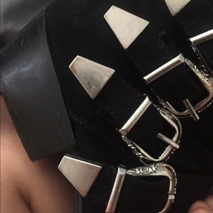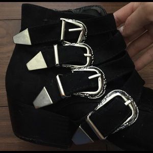 Pre-loved black booties with four buckles. Heel a bit scruffed and metal. Could be visible in the pictures. Still in good condition.