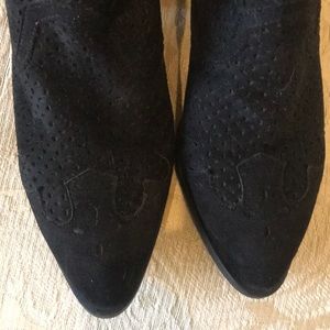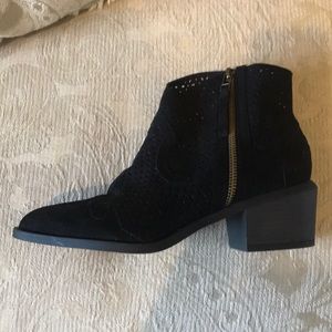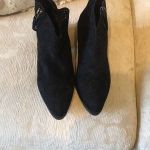 Cute very detailed vegan suede black booties . They were worn once . They are in EUC . They do run a bit large would say more like an 8 1/2 .