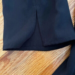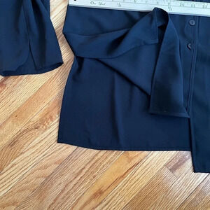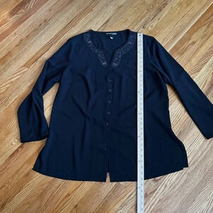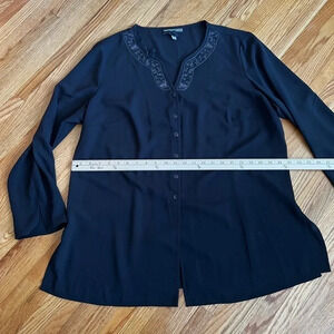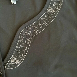 Black button down top, size 1X. Embroidered around the front of the neck with slits on the sides and sleeves. 100% polyester, in excellent used condition.