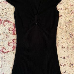 Cute black top with button providing definition. Lines on the bottom half of the shirt giving the appearance of a slimmer look. Can be dressed up or worn at a casual event. Sleeves cut off just cover the top of the shoulder.