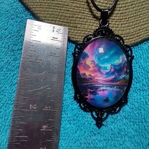 Black cabochon necklace large pendant aurora borealis ignore reflection in pics.