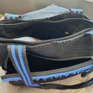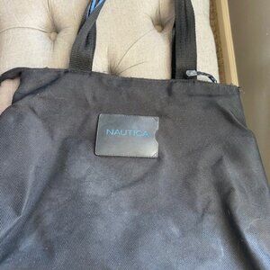 'Nautica' brand, black strong canvas carry-on totebag. Excellent for carry-on beneather airplane seat - expands nicely, but still fits. Measurements are: 16" W x 13" H. As you can see from the photos, there is some fraying on blue edges, and top of bag. Otherwise, no rips, tears or stains. Strong, durable bag for travel. Has zipped top closure, as well as an exterior large zipped pocket (see photo).