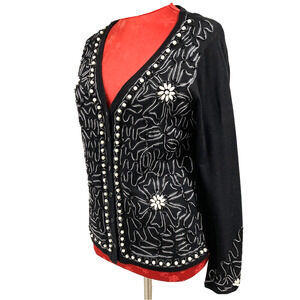 Black cardigan sweater lace applique pearl beadwork embellishment dressy size M