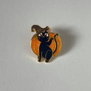 Features a glittery pumpkin and a cute kitty with a witch hat