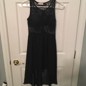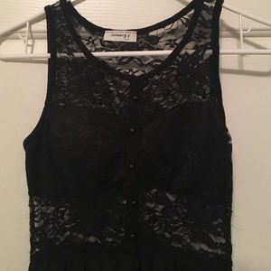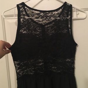 Black chiffon dress with lace detail. See through back and midriff area. Black button detail down front