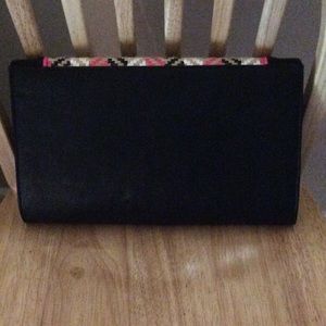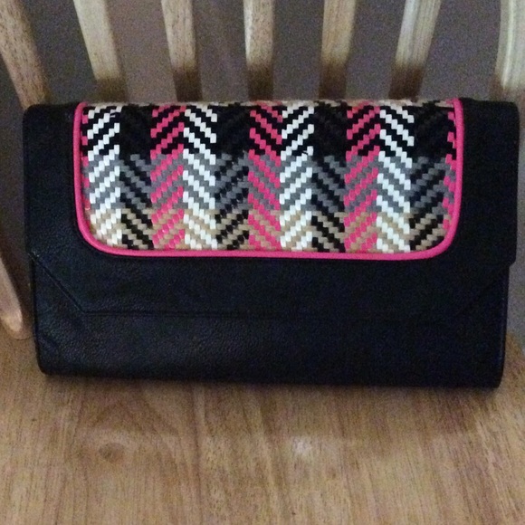 Brand new black clutch with pink, black, white and tan woven pattern on flap. Purse is about a foot across so there's plenty of room. A chain strap is included