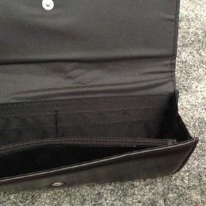 Black clutch/wallet with 3 pockets, one zipper pocket and 4 card slots. Has wrist strap.