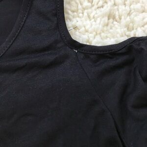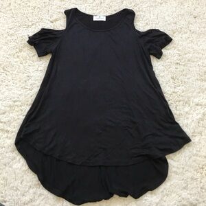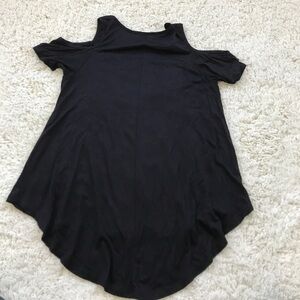 Black cold shoulder top. Soft, thin material. Never worn. Small hole visible in 3rd picture