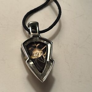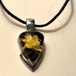 Black crafted glass floral pendant with reverse etched design on black cord.