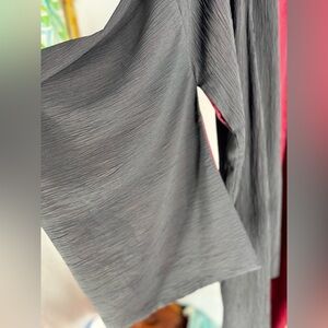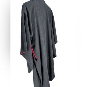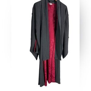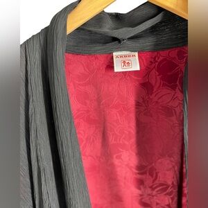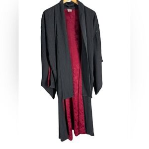 Black crepe fabric with satin lining kimono robe. In excellent condition. The total length is 50 and the pit to center hang is 12 inches so about a 24 inch pit to pit measurement when on
