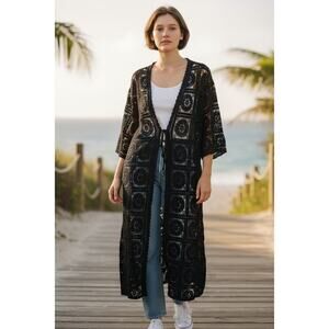 Black crochet full length tie front sweater. AZ brand new without tags Features 100% cotton granny square crochet pattern , 3/4 sleeve, tie front- one size fits most.