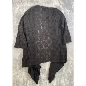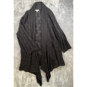 Black crochet knit open-front duster cardigan. Flared sleeves with button detail. Lots of movement and drape due to cut. Nice thick crochet is very warm. Made of cotton/ramie blend. Excellent layering piece for year-round! Can be dressed up or down, you will want to wear this piece every day! Made by Woman Within and marked a size 22/24.