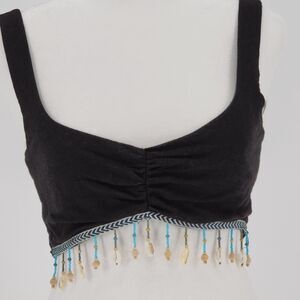 Chevron black & white ribbon on under breast. The beading is black, blue, tan, and sea shells.