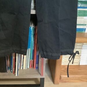 Black pants of a cotton polyester nylon mix. Good condition with no fading. Pockets in back are functional and ties at hem can be used to tighten or loosen hem, I am 5’ 4” and they are crop length on me but could be capri on someone taller one pocket on front right side