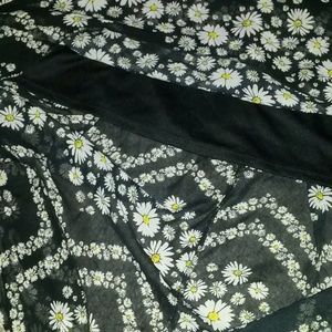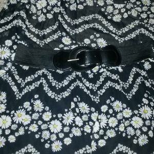 Gently used black daisy printed skirt with black slip attached underneath, and an elastic waist band belt.