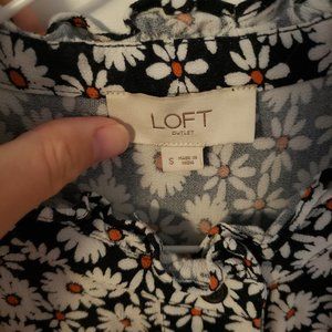 This sleeveless blouse is black with a daisy pattern. It has cute ruffled cap sleeves and ties in the back with a ribbon. There are functional buttons that go part way up the front of the blouse.
