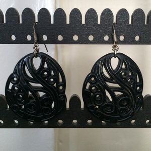 Cool set of black earrings. A little over an inch, but check the picture of me wearing them for an approximate size. Hooks are a bit rusty, but easily still worn or switched out.