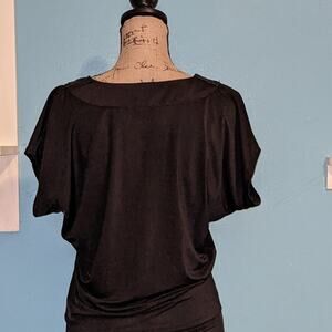Shiny black blouse perfect for a night out on the town. The v-neck is embellished with sequins.