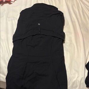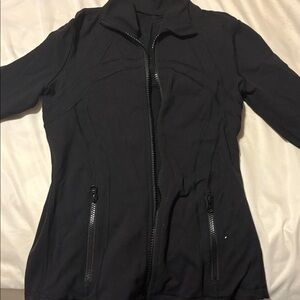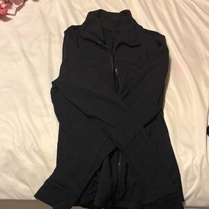 black zip-up jacket with a high collar. Tight fitting athletic wear. Slightly linty but not damaged.