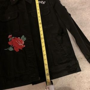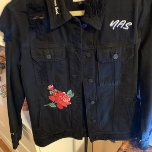Black denim jacket with Nobody Asked You embroidered on it