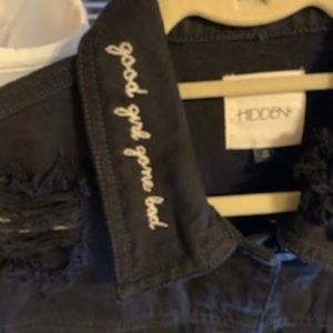 Hidden Jeans jacket in deconstructed denim featuring "Nobody Asked You" embroidered script and embroidered.