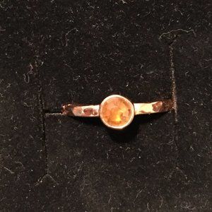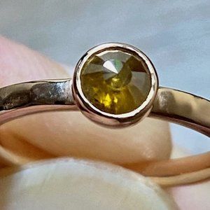A beautiful black diamond set into a thick, hammered 14k rose gold ring.