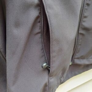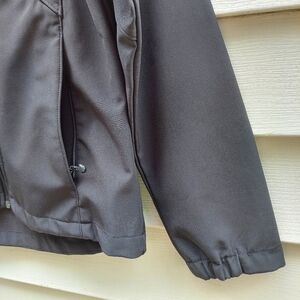 black zippered "Black Diamond" brand water resistant jacket. zippered pockets. one on left chest, 2 on side. inside is slightly fuzzy. slightly gathered wrist at end of sleeve