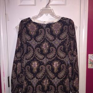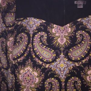 This dress is black with brown and pink paisley patterns. It is long sleeved and synched at the wrist. This is gently worn and comes from a smoke free home.