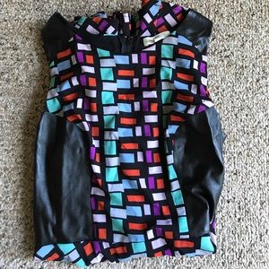 This dress is black with blocks of color, has little leather patches on the sides and top. Very unique , worn a few times. Could fit XS -S