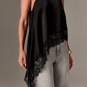 Black elegant Women's Sleeveless High Neck Lace Trim Asymmetric Satin Top