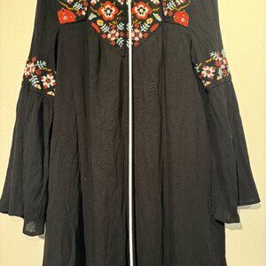 A black flowy long-sleeve dress with red and teal flower embroidery detailing gives this layered black dress the perfect accent. Long enough to pair with tall socks and boots this also looks cute styled with leggings or jeans for colder weather.